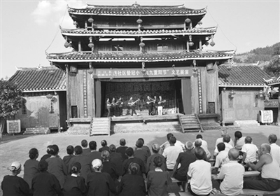 10月13日,三江侗族自治县民族文化进社区暨冠小“九九重阳节”文艺展演在该县林溪乡冠小百家宴基地举办。侗族同胞以侗歌、侗戏、多耶舞、百家宴等方式传孝道、唱和谐,并为村内70周岁以上的老人发放红包及礼品,祝愿老人健康长寿、安享晚年。图为老人们在观看文艺表演。