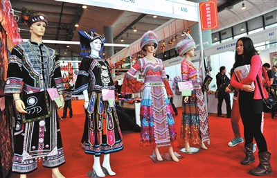 图为10月19日,一名观众在展览会上欣赏隆林各族自治县民间工艺师手工刺绣的作品《壮族苗族服饰》。