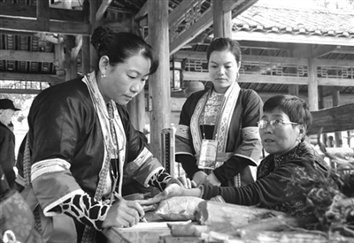 研讨会期间,专家、学者作了精彩的学术报告和大会交流,并在三江多耶广场举办侗医药展示、义诊等活动,营造了一个互相学习、交流经验、共同探讨的良好氛围。图为侗族医药专家在为群众把脉。