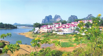 说起甘圩镇达洞村那望村的美丽,清代武邑人曾有“敢高从地起,洞古胜桃源”的诗句。原来,达洞村那望屯是一个很古老的村屯,山洞里保留着七具巨人骨骸化石,山下有那望、坛横两座水库,有马村、骝骆山、横山(壮语“岜望”)古寨——横山寨,正是对应了《读史方舆》“横山寨在(武缘)县南四十里”“设有马市”的记载。骝骆山,坐落在都南高速路武鸣至南宁的路旁,好似骆驼饮水般的骝骆山有多个洞穴,步入天坑洞底可以观赏到美轮美奂的钟乳石奇观。因地处水源头而建起了水库,山位于达洞村那望、坛横两座水库之间,一南一北,敢洞底部贯通,水流前后相承。那望湖的水源来源于那界山下的一个泉眼,经地质考察队探测定为“上升泉”,泉水上涌流入湖再入洞,形成深潭,出洞再成湖泊,向西南流入村屯溉田,因而形成了“豁然开朗,良田美湖茶山呈现”的世外桃源奇观。