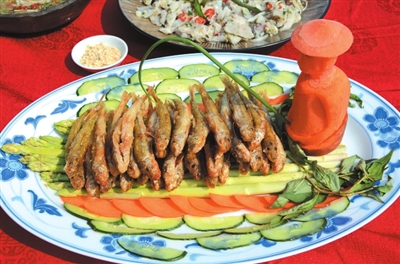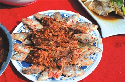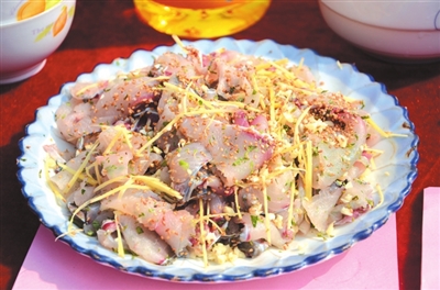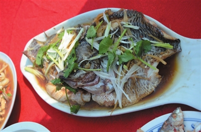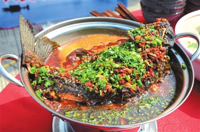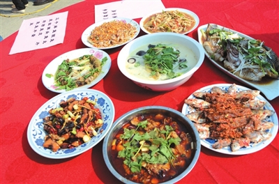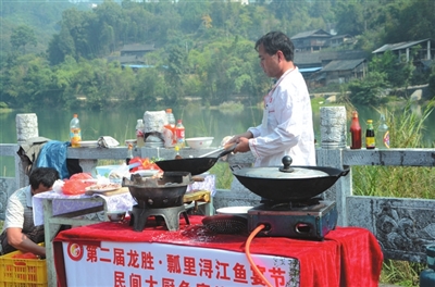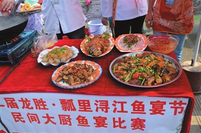 当天,瓢里镇滨江广场挤满了人,广场上几十个身穿白色厨师服的男女分外引人注目。他们一字排开摆上桌子、厨具,从箱子里拿出一条条活蹦乱跳的鱼,原来他们都是瓢里镇各村寨的民间厨师,来参加鱼宴节烹饪比赛。切丝、摆造型……,为了赢得比赛,每个参赛村寨都是几个人一起上阵。炖、煮、焖、煎,大家各显神通,场面十分壮观,吸引不少群众观看。只一个多小时,厨师们就做好了鱼生、黄焖鱼、全鱼宴,等待大家品尝。