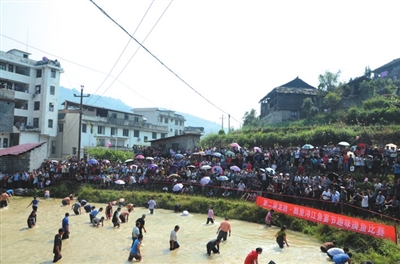 鱼宴做得热闹,村民们在田里捉鱼也非常开心。在街道附近的一块田里,以村委为单位的千人“浑水摸鱼”大军,在一声号令后,卷起裤腿跳进田里,争先恐后看谁捉的鱼多。