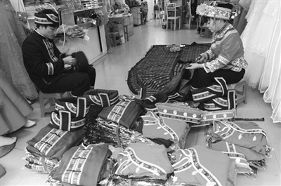 依饭节是仫佬族人民特有的传统节日,距今已有500多年历史。11月21日至23日,罗城仫佬族自治县将举办中国·罗城第二届仫佬族依饭节。节日活动主要有民俗巡游、民族风情歌舞表演、民族传统体育展演、仫佬剧《玉笛情缘》演出、走坡歌圩等内容。为了能够在节日里穿上自己特制的民族服装,不少仫佬族妇女加班制作。图为11月3日,该县东门镇的仫佬族妇女在赶制民族服装。(吴耀荣 摄)