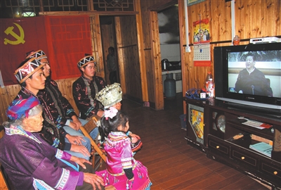 图为11月12日晚,在融水苗族自治县融水镇长赖苗寨,苗族群众在收看《新闻联播》关注十八届三中全会公报。