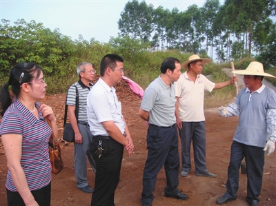 ▲自治区民语委副主任王泉忠(右三)到驻点村贵港市港南区芦山村现场检查“美丽广西清洁乡村”工作情况。
