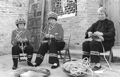 时下正值农闲时节,罗城仫佬族自治县许多农村妇女利用麦秆编织草帽、草凳和其他草编工艺品,然后拿到市场上销售,增加收入。原来废弃的稻草秸秆,如今成为当地农民农闲时节增收致富的“金条”。图为11月25日,该县东门镇中石村石围屯妇女在用麦秆编织草帽。(韦如代 摄)