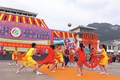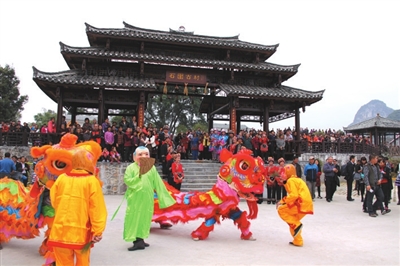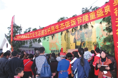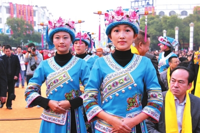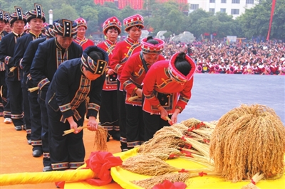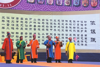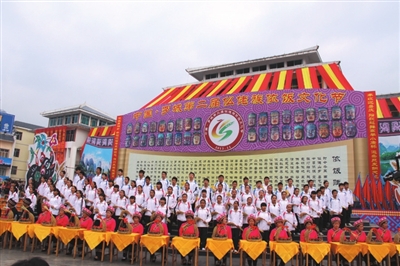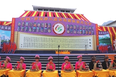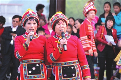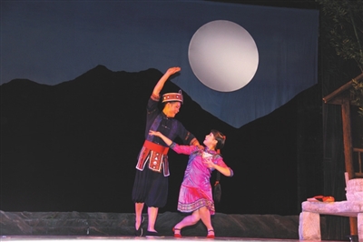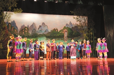 21日下午举行的“走坡歌圩”环节首先拉开了本届文化节序幕,多名仫佬族歌手在歌圩中一展歌喉,声声唱起:“依饭佳节走坡来,仫佬山乡摆歌台;清洁乡村好处多,山歌对唱心开怀。”当晚8点,罗城县民族剧院座无虚席,在悠扬的民族音乐声中,一场关于惩恶扬善的大型新编历史仫佬剧《玉笛情缘》在此上演,为本次文化节增添了一抹亮色。