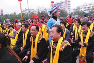 自治区党委原副书记潘琦,自治区人大常委会原副主任张正铀,自治区民委副主任吴代慧、自治区民语委副主任王泉忠,河池市领导刘先明、唐标文、黎丽、银建军、银景生、莫宏盛、徐钦恒、马丹葵等以及嘉宾、乡友代表和离退休老领导参加了开节仪式。