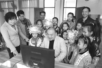 12月2日,柳州市政协、融水苗族自治县政协组织牵头,柳州市政协委员陈晓丰出资购买15台新电脑、15套新桌椅,捐赠给该县融水镇“留守儿童之家”贝林小学,320多名留守苗娃将可免费上网。图为陈晓丰在给苗娃示范上网。(廖子渊 摄)