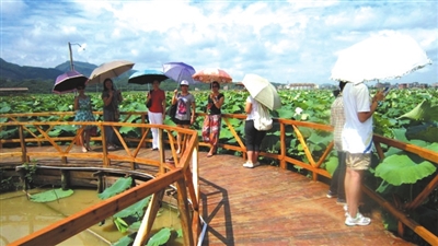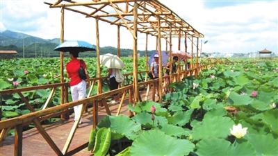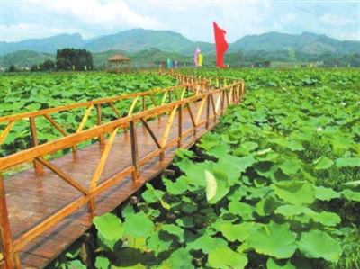 宾阳县“荷香人间”万亩荷田休闲旅游观光农业生态园项目规划总面积为10000亩,其中稻、藕(莲)生产基地5000亩,旅游休闲农业生态示范园2700亩,旅游休闲农业体验园2000亩,产品加工及商贸物流园300亩。计划总投资2.36亿元,分三期实施,第一期投资4000万元。项目自2011年开始实施,已完成投资1800万元,完成了项目总规设计、景区大门、游览步道、观赏亭、停车场、采摘体验园等建设。今年,核心示范区稻藕(莲)种植面积发展到600多亩,辐射带动周边种植面积6000多亩,有力促进了现代农业发展!