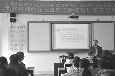 12月9日至10日,自治区教育厅民族教育处处长韦兰明、壮语文译审零兴宁等一行3人来到武宣县调研壮汉双语教育工作。调研组先后到县民族中学、桐岭镇部分小学了解学校基础建设、校园民族文化建设及师生教学生活情况。在桐岭镇中心校,韦兰明给正在参加培训的教师们做了一堂壮汉双语教育专题讲座。在桐岭镇新龙小学,调研组走进课堂听了一节壮汉双语课。图为韦兰明在给壮汉双语教师培训班学员上课。