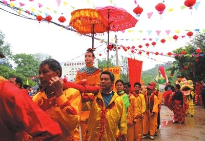 在壮乡武鸣的“三月三”歌节这一天清晨,方圆数十里的成千上万男女青年穿着节日民族服装,带着染红的鸡蛋和五色糯米饭,从四面八方汇集而来参加赛歌。各村男女青年三五成群,通宵达旦地对唱山歌,一唱一和,热闹非凡。有的在对歌中播下了爱情种子,结为终身伴侣。赛歌中,还进行有趣的抛绣球、抢花炮、碰蛋等游戏娱乐活动。欢乐的歌声使游人分享到壮族特有风俗的情趣。关于三月三歌节的来历,壮族民间有许多优美动人的传说。其中一个美丽的传说与壮族歌仙“刘三姐”有关。相传,在唐代,壮族出了一个歌仙,名叫“刘三姐”。她聪明过人,经常用山歌歌颂劳动和爱情,揭露财主们的罪恶,财主们对她又恨又怕,因此有一年的三月初三,乘刘三姐在山上砍柴时,财主派人砍断了山藤,使她坠崖身亡。后人为了纪念这位歌仙,便在刘三姐遇难这天聚会唱歌,一唱就是三天三夜,年年如此,歌圩就此形成。宋人著的《太平寰宇记》中就有记载:“壮人于谷熟之际,择日祭神,男女盛会作歌。”这说明当时的歌圩也很兴盛。宋元以后,壮族山歌的发展尤为突出,歌圩也成了文化娱乐和男女谈情说爱的场所,并出现了抛绣球的游戏。女子将绣球抛给自己心仪的男子后,双双退出歌场,互赠定情信物。到了清代,便形成了成千上万人参加的大型活动。1934年编的《广西各县概况》记载,当时广西有歌圩活动的就有26个县,几乎遍布广西各地。