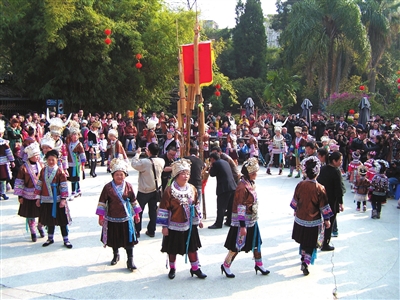 12月21日, 晴空万里,阳光灿烂。广西民族文物苑内,锣鼓喧天,歌声飞扬,在邕工作的苗族同胞700余人在这里载歌载舞,欢庆第27届苗年节。