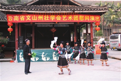 滇桂两地壮族同根同祖,贝侬情深,多年来,两地贝侬友好往来,开展了许多有益的交流活动,广西壮学专家、学者多次去到文山,为文山壮族文化的保护与开发出谋划策。为了表达对广西壮学专家、学者的谢意,在新春来临之际,1月4日,文山州壮学会艺术团30名队员来到南宁,在广西民族文物苑,以宣传文山壮族原生态文化慰问演出的形式,给广西壮学会领导、壮学专家、学者拜早年。
