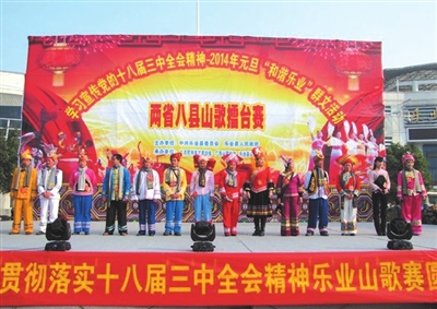 新年伊始,来自黔桂两省(区)8个县的少数民族山歌手代表汇聚乐业县擂歌,分别用壮汉“双语”以对歌的方式庆祝新年,唱响黔桂红水河两岸各民族和谐之歌。