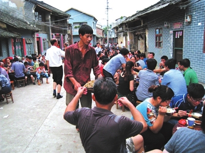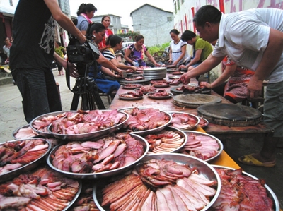 在城隍爷巡城仪式举行完毕之后,各街各巷的邻里乡亲会聚在一起吃一顿“和饭”,也叫“和家宴”,等同于现在的“百家宴”。人们为筹备“和家宴”,全城各大街小巷的乡亲们都会老少齐上阵,一起动手制作菜肴。以古城内的东、南、西、北4条街道为场地,在街道上摆起一长串桌子,一张紧挨一张地摆放在那里,成为一张张长长的餐台。各家各户将自家烹制几道最好的菜献上酒桌,全城人一起品尝,也款待各路来宾。“和家宴”不仅能喝到香醇的米酒,还可以品到中渡古镇8大特色家常菜,如毫细松、杂碎、清水羊肉、肚肺汤、香叶包、莲藕红肉、酸甜肉圆、粉蒸肉。