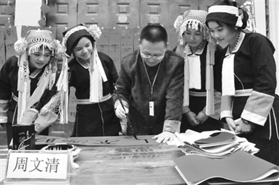 1月9日,中国人寿、百色市医保中心、右江书画院联合组织市书法协会会员,深入到凌云县朝里瑶族乡六作村那巴屯开展文化惠民书画家现场书赠春联活动,为当地200多名村民现场书写赠送春联,并送上新春祝福,受到群众欢迎。图为书法家现场为群众书写春联。(罗希海 摄)