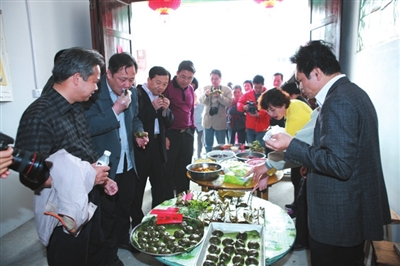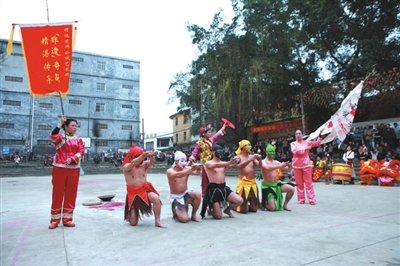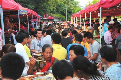 求雨、祭农具、招稻魂、驱田鬼、请稻神、稻神巡游,这6个部分,是隆安县城厢镇每年农历五月十三举行的“稻神祭”活动中必不可少的环节。这一活动,向人们展示了世代生活在右江河畔的隆安壮族先民在长期的农耕生产劳作中,用勤劳的双手和聪慧的头脑创造的一项非物质文化遗产。“稻神祭”是隆安县传承了6000多年的传统民俗活动,于2010年5月被自治区和南宁市列入自治区、市级非物质文化遗产名录,并把城厢镇江滨路的关帝大王庙定为“稻神祭”的传承基地,所以每年的农历五月十三都会在大王庙举办庆典活动。活动一开始,附近村屯的群众都来参加,在大王庙前举行的“钻关脱难”更是引来不少群众参与。稻神巡游赐福则是民众最为期盼的一种祈福仪式,为求得稻神的赐福,在巡游当中,各家各户都在自家门前焚香燃炮,恭迎稻神。而最热闹的非“百家宴”莫属了,各种祈福脱难活动结束后,当地群众和参加活动的所有宾客,其乐融融坐在一起举杯共话丰收美景。一眼望去,江滨路旁几十米长的宴席人头攒动,热闹非凡。