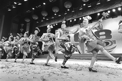 春节临近,龙胜各族自治县县城、各乡镇举办系列业余文艺会演,在当地营造欢欢喜喜过大年的喜庆氛围。图为1月22日晚,该县城西文艺队队员在2014年“我们的中国梦”春节文艺晚会上表演舞蹈《琵琶声声贺新年》。