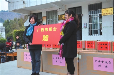 “今天广西电视台的叔叔阿姨们送来电视机给我们,还跟我们一起上课,还跟我们搞活动,还教了我们很多的知识,我们很开心!”凌云县泗城镇览金小学学生李文通说。1月8日下午,“手拉手”艺术团抵达凌云后还未顾及休息,便在第一时间内来到了泗城镇览金小学开展慰问活动,给孩子们送去学习用品,与学生交流联欢。当天览金小学校园里面绽放的是一张张单纯的笑脸,那是这个冬天最美的鲜花。广西电视台“手拉手”艺术团成员们,像从南宁闻香而来飞入这花丛中的蜜蜂,采集到的,是童年的甜蜜。在览金小学,艺术团与孩子们度过了几个小时的快乐时光。欢乐的时光总是让人觉得特别的短暂,可快乐的经历总是让人记忆深刻!