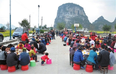 说起村里的“百家宴”,该村的“老党员”韦増义高兴地告诉笔者,这“百家宴”在村里举行已经有9个年头了,所有的开支都是村民们自发自愿出钱组织的,全村150多户700多人全部参加,并且还邀请了周边村民委的组长,大家共聚一堂,畅谈新生活,共谋新发展。