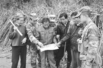 连日来,宁明县寨安乡剥皮国防民兵哨所组成全国“两会”宣传服务队,深入边境一线村屯,采取现场宣讲、发放报刊、畅谈变化等形式,向边境群众宣讲今年全国“两会”精神及惠民政策,助力兴边富民新跨越。图为宣传服务队哨兵利用巡逻间隙宣传“两会”精神的情景。(周贻刚 黎 沐 摄)