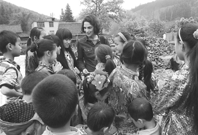 3月30日,“中国色彩协会”的爱心人士瑞士人梁定远(中文名)、法国的黎巴嫩人诺亚(中文名)与助理贾利新,走山路、坐小船、蹚小河到融水苗族自治县大年乡吉格村龙江苗寨小学了解受助苗族学生的学习情况,并与他们做游戏、唱歌、打球,其乐融融。图为诺亚与受助学生们在一起。(龙林智 龙 涛 摄)