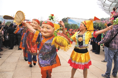 ▶4月2日,在广西民族博物馆“壮族三月三”主题活动现场,来自邕宁蒲庙的壮族群众表演花婆舞。