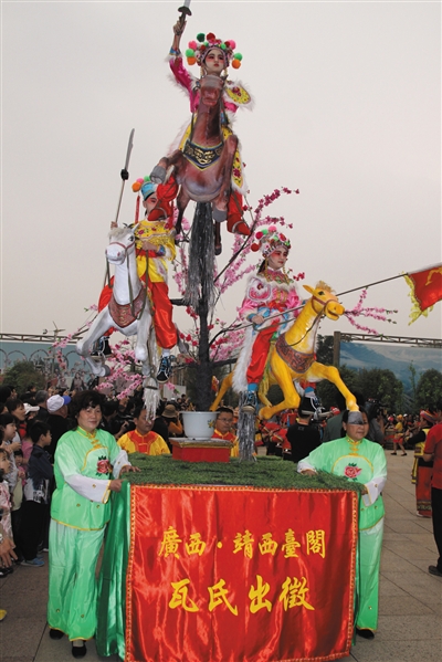 ▶4月2,在广西民族博物馆“壮族三月三”主题活动现场,来自靖西县的壮族群众表演“瓦氏出征”。 本报记者 韦愿娜 摄 |