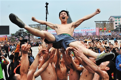 | ▲4月2日,是广西首个“三月三”法定节假日,三江侗族自治县古宜镇举办四年一度的第十三届传统花炮节,激情盛会吸引湘黔粤桂数万游客前来观赏体验。侗族花炮节是侗族独具民族特色的一项文化体育盛事,至今已有数百年历史,被称为“东方的橄榄球”,并于2008年列入自治区级非物质文化遗产名录。图为抢中头炮的喜庆场景。 龚普康 摄 |
