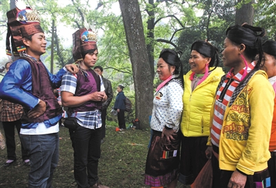 ▲4月2日,柳州市融水苗族自治县白云乡举行第32届“三月三”花炮节。当地数百名苗、瑶、侗、壮、汉各族同胞身着节日盛装参加对山歌、扳拳、抢花炮等民俗活动,祷求风调雨顺、五谷丰登、幸福安康,苗山深处变成数千游客欢乐的海洋。图为瑶族青年在树林里对山歌。 龙林智 龙 涛 摄 |