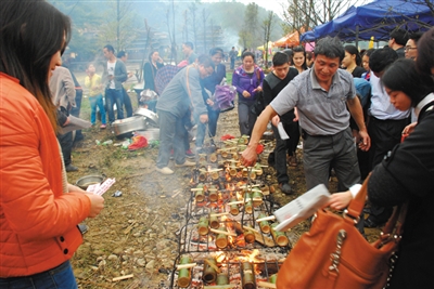 | ▲4月2日,蒙山县长平瑶族乡群众欢度“三月三”,品尝烧竹筒饭。 黄建源 关 新 摄 |