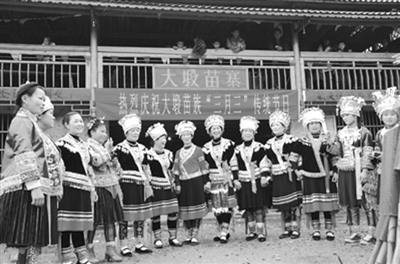 原生态的苗族民间芦笙表演,丰富的文艺展演活动,伴着主持人对苗族民俗风情故事的讲述,身着盛装的苗家少女唱着敬酒山歌,为来宾们献上颇具民俗风味的糯米饭、酸肉,酸鱼,让宾客们在一饱苗家饮食口福的同时,了解苗家的传统文化。图为身着盛装的苗家女唱着歌颂民族团结的山歌。(杨远鹏 韦祖祠 摄)