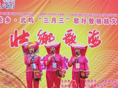 “中国梦是我的梦,时时刻刻记心中;衣食住行样样好,中国之梦不落空。”一首首甜美的山歌从武鸣壮乡飞向云天。壮乡三月,百花齐放,春意盎然;三月壮乡,唱响旋律,盛世欢歌。4月1日至7日,2014年中国壮乡·武鸣“三月三”歌圩暨骆越文化旅游节隆重举行举行, 文化、体育、旅游、经贸活动形式多样、精彩纷呈,把武鸣变成同欢大舞台。以下是记者现场拍摄“壮乡歌海”的一组镜头,以飨读者。