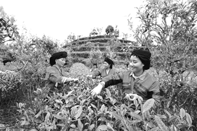 4月20日是二十四节气的谷雨,位于龙胜800米海拔以上的龙脊云雾茶进入采摘高峰期,当地的瑶族群众抢抓时节采摘谷雨茶。同时,当地的瑶族群众还在采茶的小山头上开展古茶树祭祀大典、唱采茶歌、跳采茶舞,活动吸引了大批游客和摄影爱好者前来观看。图为在该县龙脊镇中禄村的生态茶园里,当地的瑶族群众正在采摘谷雨茶。