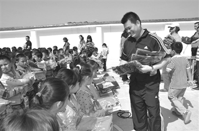 据一位不愿透露名字的朱先生说,他们在一次偶然的机会得知地处高山的朝里乡羊囊小学为该乡最远的村级中心校,200多名学生都是瑶族,且大都是留守儿童。这里交通不便,条件艰苦,学生常年衣服单薄,至今没有统一校服。朱先生把这些情况反映给南宁的爱心人士,经过牵线搭桥,他们利用“五一”长假期间来到羊囊小学献爱心。 图为爱心人士给留守儿童分发校服。