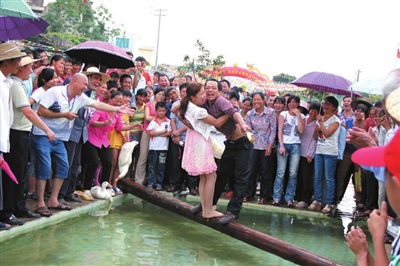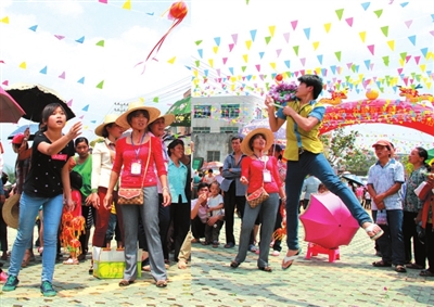 当天,在大明山脚下的马头骆越文化广场,聚满了前来观光旅游的游客和马头十里八乡的群众数千人,精彩的文艺演出和丰富多彩的民间民俗表演、竞技活动调动了广大人民群众的参与热情。开幕式精彩的文艺演出之后,打陀螺、抛绣球、三人拔河、背水顶竹杠、壮族回娘家、水斗戽水、棋三、虎棋、抓鱼等众多妙趣横生的项目闪亮登场,吸引了在场的观众,喝彩加油声和着欢声笑语,把整个广场变成了欢乐的海洋。瞧!那“摸鱼趣味游泳竞技”活动最热闹,围观者也是捕捞者,捕获丰收大家分享,最开心的是亲身体验久违的捕鱼习俗。那打陀螺、抛绣球、背水顶竹杠、水斗戽水、下棋三等项目,都是来源于壮族人民最熟悉、最亲切的生产生活,吸引了不少游客参与。