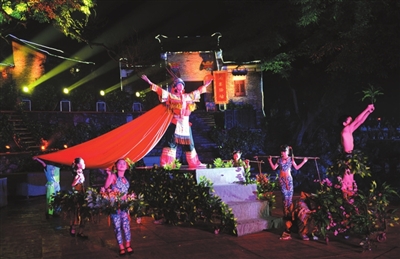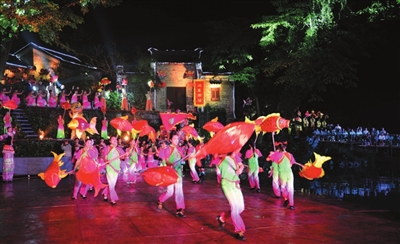 4月29日晚上,梦幻灯光映衬下的古榕、码头、客栈、水塘、竹筏这些元素构成了一个实景舞台,《大美黄姚》实景演出拉开了2014广西(昭平)茶王节暨黄姚旅游文化节的序幕。