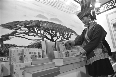 图为在“中国长寿之乡”金秀瑶族自治县展厅,一名瑶族姑娘在整理产自大瑶山的绞股蓝茶。(喻湘泉 摄)