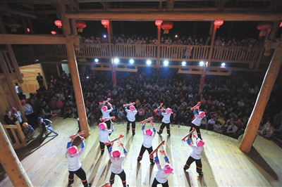 5月19日晚,在龙胜各族自治县龙脊古壮寨,游客们正在观看壮族原生态歌舞表演。