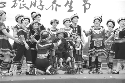 上林县山清水秀,风光旖旎,空气清新,是天然的生态养生胜地;民俗风情底蕴深厚,有着特色浓郁的壮、瑶族文化。在活动开幕式上,民俗风情表演最为精彩,现场观众喝彩不断。图为该县镇圩瑶族乡一户农民家庭四世同堂表演的原生态山歌《四世同堂唱和谐》。