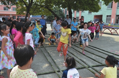 10时30分,两路调研组汇合到达桐岭镇中心校。正值课间活动,调研组专家饶有兴趣地观看学生跳竹竿舞、推铁圈等具有民族特色的活动。