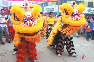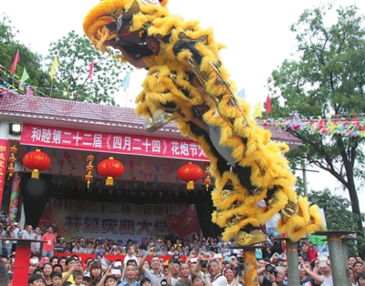 游行队伍回到主会场后,各队还进行了精彩的表演,应邀参加今年花炮节的“怀宝镇东水喷沟驻融芦笙队”和“香粉乡雨卜芦笙芒蒿队”表演起苗家特有的芦笙踩堂舞和芒蒿舞,赢得围观民众阵阵掌声。而演出的高潮是“一心堂”舞狮队的登台表演,该舞狮队两名表演者在激动人心的锣鼓声中,在约2米高的“梅花桩”上做出高难度的腾空跳跃表演,引得观众高声喝彩,掌声如雷。