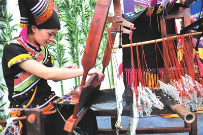 图为当天在中国-东盟博览会文化展展厅,我区靖西县的一名壮族姑娘在展示壮锦编织技艺。