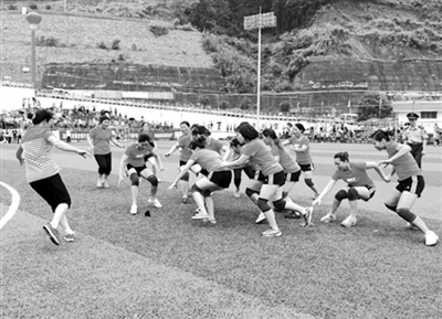 6月1日,龙胜各族自治县举行女子抢花炮比赛,吸引众多市民和外地游客前来观看。“抢花炮”是当地传统体育活动,被称为“东方的橄榄球”。比赛时将缠着红色绸布的铁环置于铁炮口,点燃后铁环被炮冲至上空,待其坠落时,人们分成若干队蜂拥抢夺。最终的获胜者能够获得大肥猪等战利品。图为在该县体育场,妇女们正在激烈地争抢花炮。(韦吉阳 贾丽平 摄)