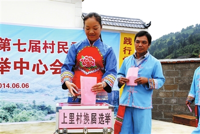 6月6日,在融水苗族自治县大浪乡上里村,一名壮族妇女选民在村民委员会换届选举中投上了自己神圣的一票。