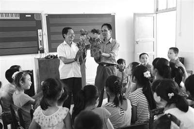 迎接6月14日第9个全国文化遗产日的到来,6月12日,民间艺人应邀到昭平县第一小学,开展非物质文化遗产木偶戏进校园活动,民间艺人进行现场展示、展演,与学生互动,让学生感受非物质文化遗产的独特魅力。为图为民间艺人给学生们表演木偶戏。(刘 飞 摄)