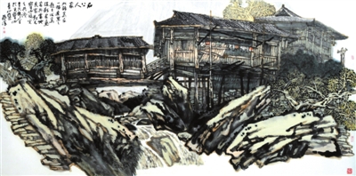 教授:我选择元宝山作为创作基地,这是“天作之合”,更是艺术的钟情。山水画追求“土味”,讲究“质朴之味”。元宝山远离现代都市,保留着非常“土”的少数民族建筑,这种形式奇特的民居是中国传统榫卯结构建筑。上百年的老木楼,看上去东倒西歪,但实际上稳如磐石,这使画家感觉特有的动势,充满创作的灵感;而这些木楼基建构在山间巨石之上,更使画家时刻感受和体验少数民族传统建筑的“原汁原味、土里土气”。多年的创作经验告诉我们:山水画要根植于本土、忠实于山川,既要画出广西秀美的山川和古朴的民风,又要画出八桂悠久的历史和美好的明天,在艺术领域创造一个山青水秀的“山水广西”、人杰地灵的“人文广西”。而元宝山,正好蕴含着这样的艺术资源和创作境界。可以说,是元宝山的生态文化特质赋予我无穷的创作灵感,而我的山水画又激活了沉睡山脉特有的艺术魅力,这就是一个画家与一座山之间特有的情感。