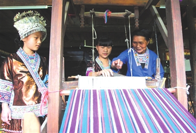 暑假期间,融水苗族自治县苗寨里的苗锦传承人免费教中小学生织苗锦、苗布,传授民间织布技艺,传承民族文化,使中小学生度过一个有意义的暑假。