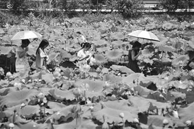 近年来,三江侗族自治县良口乡和里村村民利用“国保”和里三王宫景致,在321国道两旁租种稻田10公顷,实施太空莲繁育及莲鱼套养示范推广项目。每逢夏日,荷花绽放,引来游客赏花、品鲜鱼,实现产业互动,丰富民族文化旅游内涵,拉动稻鱼产业链,最大优化特色产业的效益。图为游客在欣赏荷花。